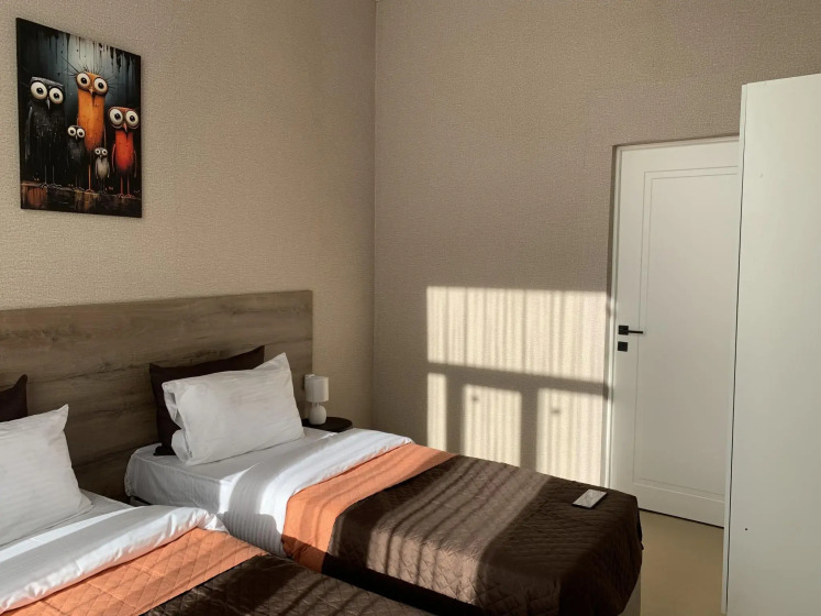 Чисто, уютно, было тепло, несмотря на -25 за окном. Вместо телевизора был плакат, что он будет, поэтому было тихо. Постоянный контакт с администратором через мессенджер.